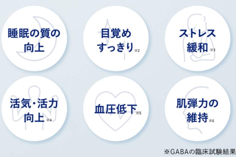 【届出表示内容】本品には、GABAが含まれます。GABAには、血圧が高めの方の血圧を低下させる機能、睡眠の質(眠りの深さ)の向上に役立つ機能、すっきりとした目覚めをサポートする機能、肌の乾燥が気になる方の肌の弾力を維持し、肌の健康を守るのを助ける機能、仕事や家事、勉強による一時的なストレスや疲労感の緩和およびリラックス作用があることが報告されています。また、継続的な摂取により、日常生活で生じる一時的な活気・活力感の低下を軽減することが報告されています。