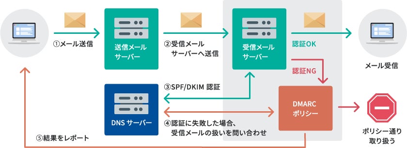 DMARCでは、「なりすましメールを受信した場合は拒否する」というポリシーを送信側が設定しておくと、受信サーバーはそのポリシーに従って該当するメールの受信を拒否します。また、メールの処理結果を受信サーバーから送信側へレポートする機能もあります。このレポートから送信側は、なりすましメールの送信元サーバーを確認し、対処することが可能になります。