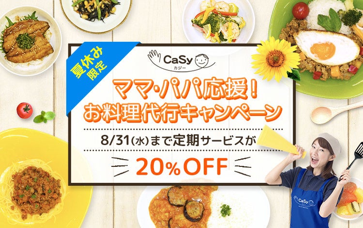株式会社CaSy(本社:東京都品川区、代表取締役CEO:加茂雄一、以下カジー)は、本日8月1日(月)から8月31日(水)までの期間限定で「【夏休み限定】ママ・パパ応援!お料理代行キャンペーン2022」を実施します。コロナ禍が継続する中、昨年好評を博した夏季限定のキャンペーンが今年も帰ってきます。お料理代行の定期サービスが、期間中なら何度でも20%オフの料金で利用できます。ご家族のお食事やお子様のお弁当など、子育て世帯の負担をお料理代行で応援します。