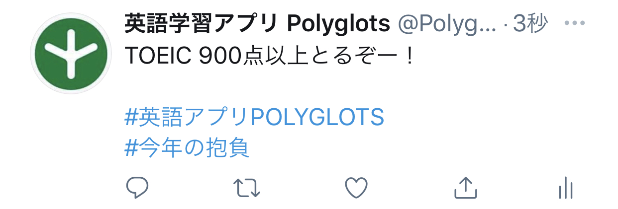 ③ 2つのハッシュタグ「#英語アプリPOLYGLOTS」「#今年の抱負」を入れて今年の英語学習について、アナタの今年の抱負を投稿