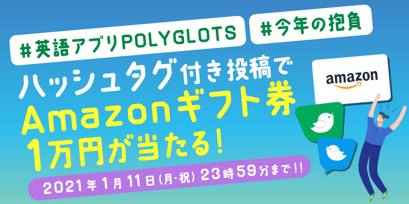株式会社ポリグロッツ(本社:東京都新宿区、代表取締役:山口隼也)は、2021年お年玉企画として1月1日(金・祝)~1月11日(月・祝)まで、Twitterプレゼントキャンペーンを開催いたします。ご応募いただいた方には抽選で、10名の方に「Amazonギフト券10,000円分」30名の方に「Amazonギフト券1,000円分」プレゼントいたします。