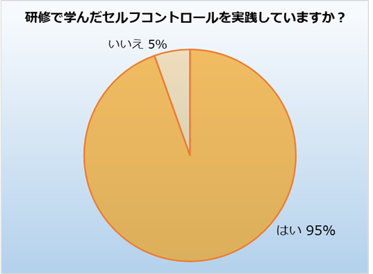 これまでに約600名の介護スタッフが研修に参加しており、研修1か月後のアンケートでは、「自分の中の“べき”を見直し、許せる範囲を広げる努力をしている」、「6秒カウントしながらゆっくりと呼吸し、自分の気持ちをコントロールしている」、「怒りのメカニズムを学んだことで、スタッフとのコミュニケーションの重要性がわかった」、「なぜ相手がそのような言動をしているのかを俯瞰して考えられるようになった」など、約95%のスタッフが研修で得たスキルに対して実践しています。