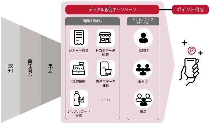 本サービスは、現在約8900万人※1の利用者を数える「dポイント」を組み合わせたデジタル販促ソリューション商品で、インセンティブとしてdポイント(期間・用途限定)を進呈することが可能となります。また、多種多様な購買証明手法とインセンティブ付与方法を柔軟に掛け合わせることで、バリエーションに富んだデジタル販促キャンペーンの設計・カスタマイズが可能です。