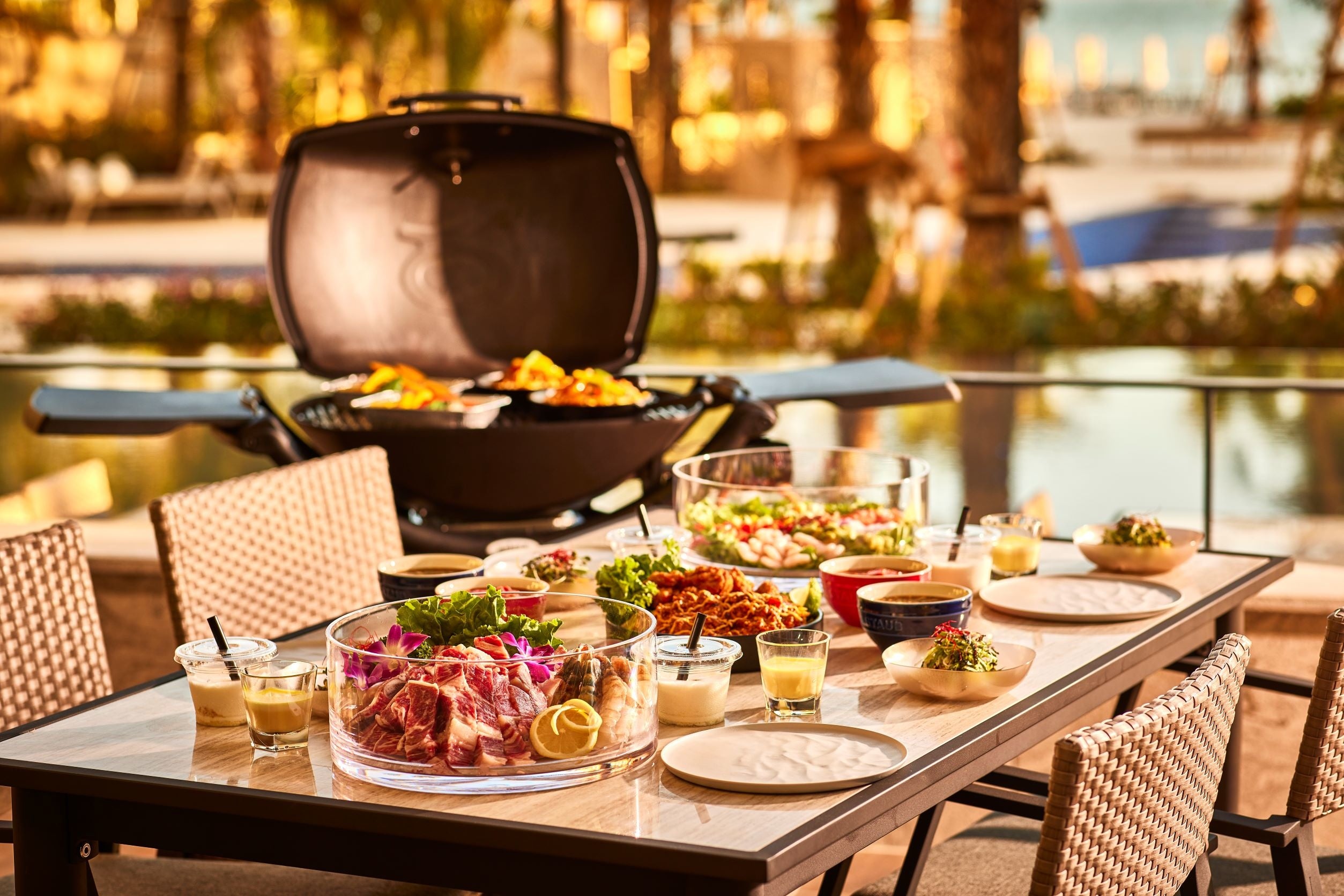 マジックアワーの美しい海を眺めながらフルコースをお楽しみいただけるリゾートファインダイニング。メインの肉厚で柔らかなローストビーフの他、シーフードの一皿も。ライブキッチンにはダッチオーブンを備え、料理を仕上げる様子を間近でご覧頂けます。味はもちろん、音、香り、シェフの動きまでダイナミックに五感で愉しむダイニングタイムをお過ごしください。