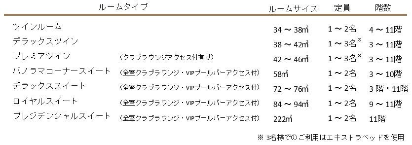 なお、スイートルーム全室とプレミアクラブルームはクラブラウンジへのアクセス付きとなっており、さらにワンランク上のサービスをご用意しております。