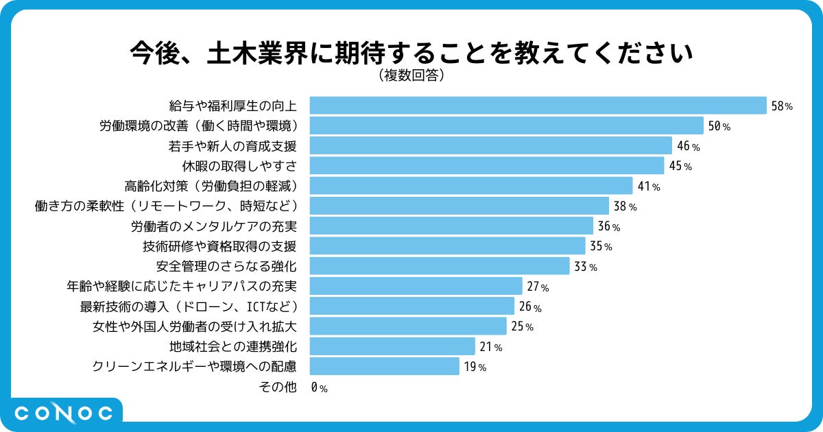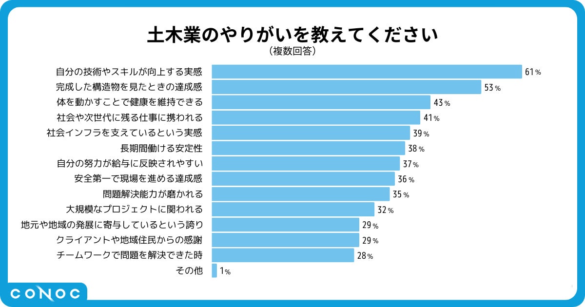 最も多く挙げられたのは「技術やスキルが向上する実感」(61%)で、次いで「完成した構造物を見たときの達成感」(53%)や「体を動かすことで健康を維持できる」(43%)が続きました。また、社会貢献やインフラ支援、安定性、給与への努力の反映なども多く、自己成長や達成感、社会的意義が土木業のやりがいの中心であることがわかります。
