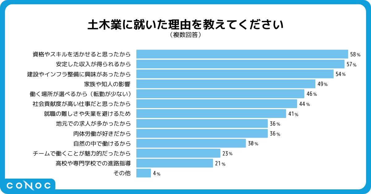 最も多かったのは「資格やスキルを活かせると思ったから」(58%)、次いで「安定した収入が得られるから」(57%)や「建設やインフラ整備に興味があったから」(54%)が挙げられ、業界の安定性と専門性が魅力となっていることがわかります。また、「家族や仲間の影響」や「働く場所の選択肢が豊富で転勤が少ない」点も就職動機として評価されています。