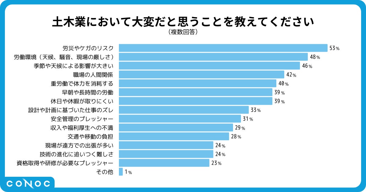 建設業界のDXを推進する株式会社CONOC(本社:東京都渋谷区、代表取締役:山口一、以下:CONOC)は、土木従事者537名を対象に「土木業に関する実態調査」を実施いたしました。本調査では、業界への就職理由や仕事の魅力、さらには業界の課題や改善案など、従事者の生の声を集めました。その結果、業界の安定性や技術習得の魅力が評価される一方で、安全性や労働環境への課題感も浮き彫りとなりました。