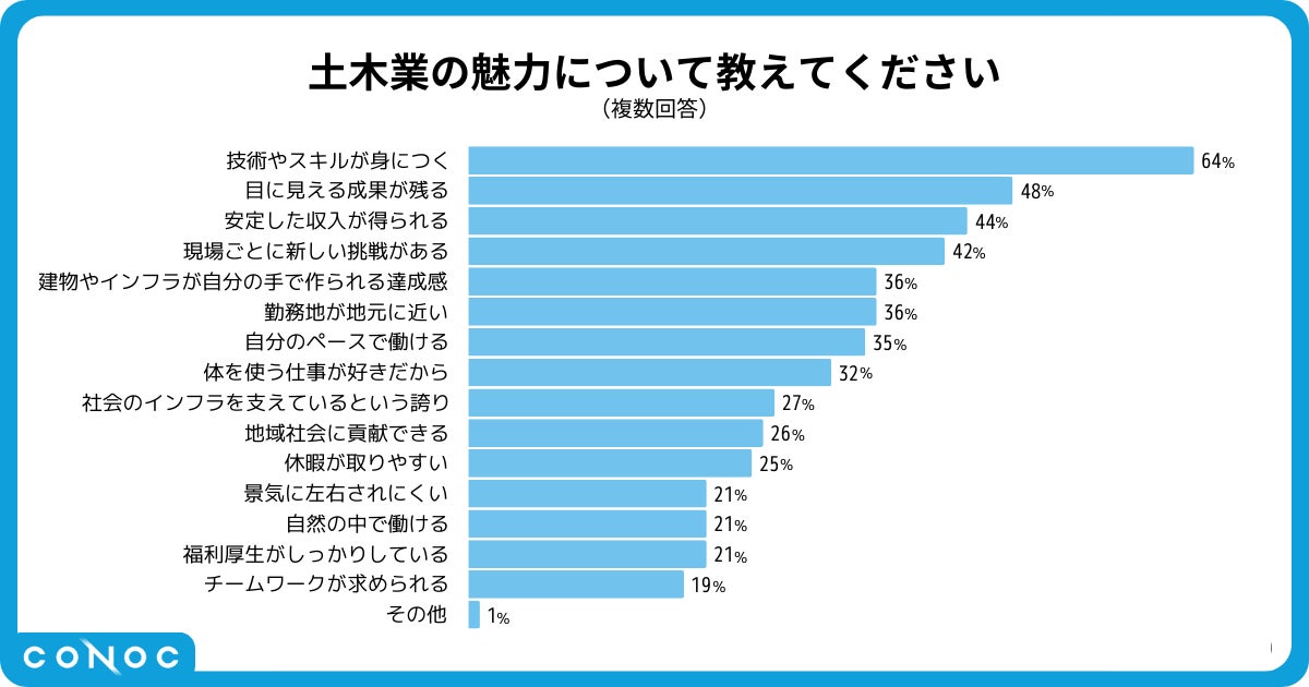 土木業界では「技術習得」(64%)や「目に見える成果が残る」(48%)といった専門性や実績の可視化が高く評価されており、安定性や達成感を伴う仕事環境が業界の魅力となっています。また、「現場ごとの新しい挑戦」や「インフラ整備に直接貢献する実感」など、創造性や挑戦心を刺激する側面も支持を集めており、土木業がやりがいを感じやすい職場であることがうかがえます。