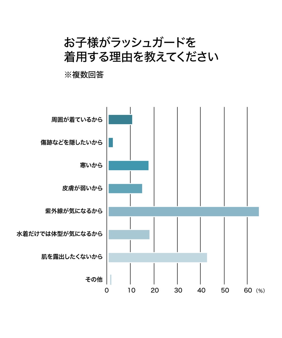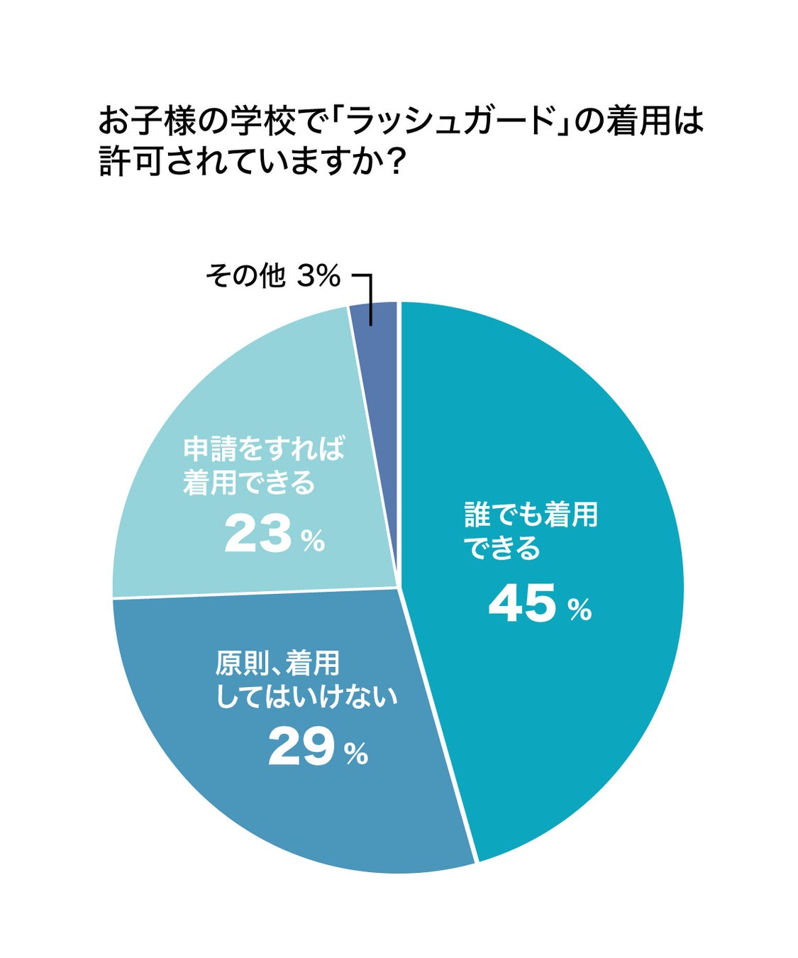 また「ラッシュガード」の着用許可については「誰でも着用できる」が45.6%、「申請すれば着用できる」が22.8%と合わせると68%の学校で許可されていることが分かりました。実際に着用している生徒は37.9%で、その「ラッシュガードを着用する理由」は、「紫外線防止」が1位。2位に「肌を露出したくないから」となりました。