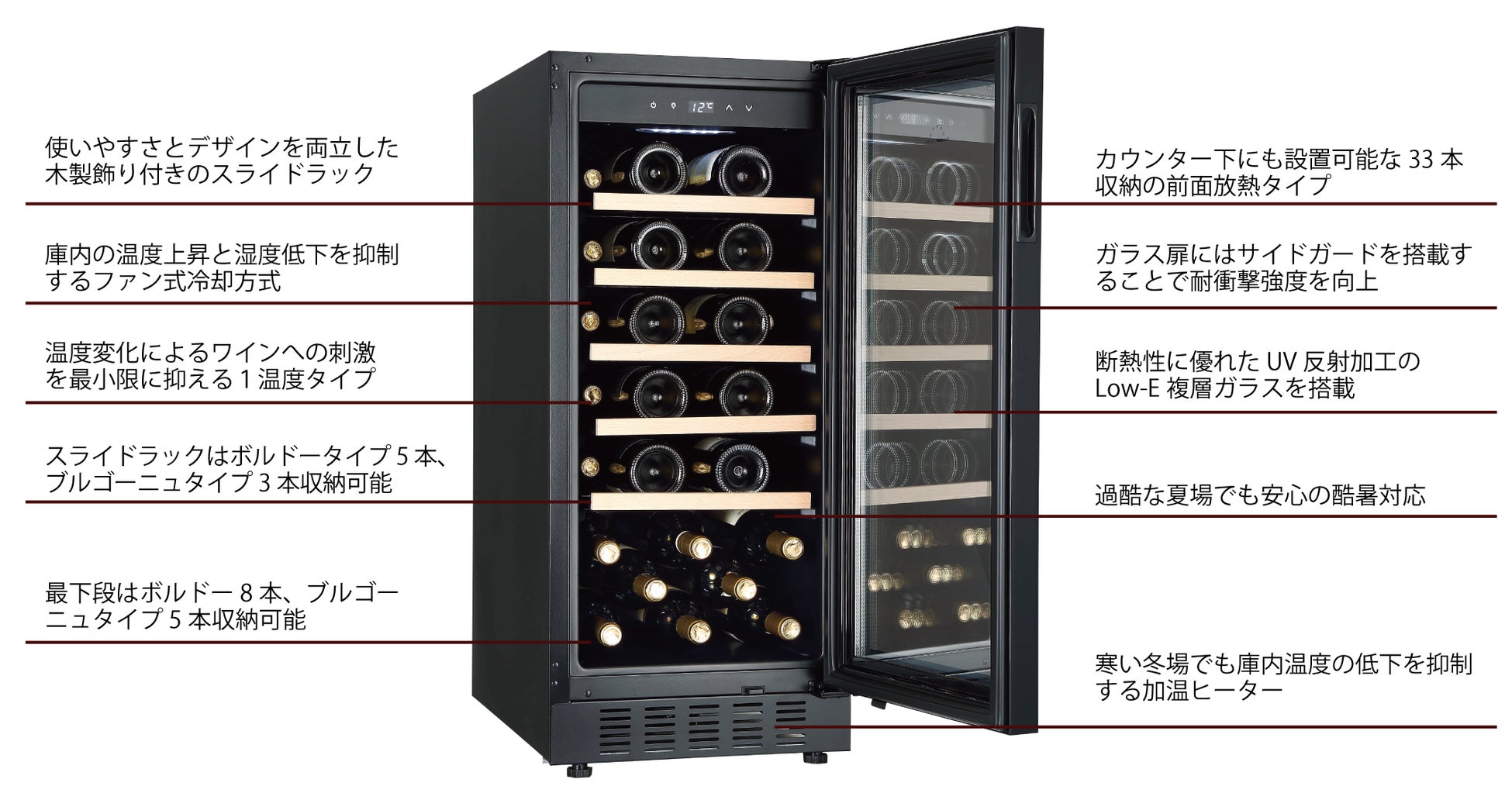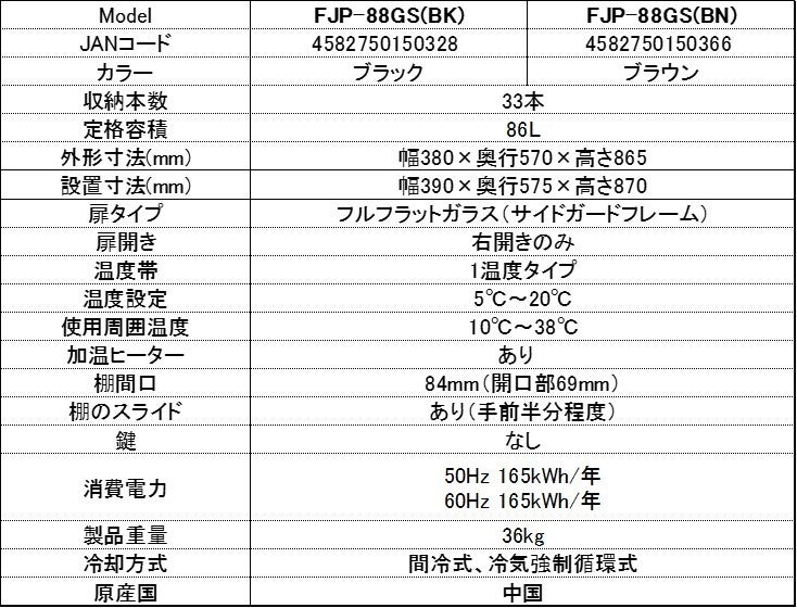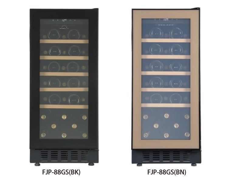 本製品は昨年発売した小型セラー「FJP-57GS」と同じ前面放熱タイプであり、20本収納の「FJP-57GS」よりも一回り大きく、33本収納の中型タイプセラーとなります。前面放熱ですので、通常のワインセラーのように据え置きとしての使用はもちろん、カウンター下などへビルトインとして設置することも可能です。