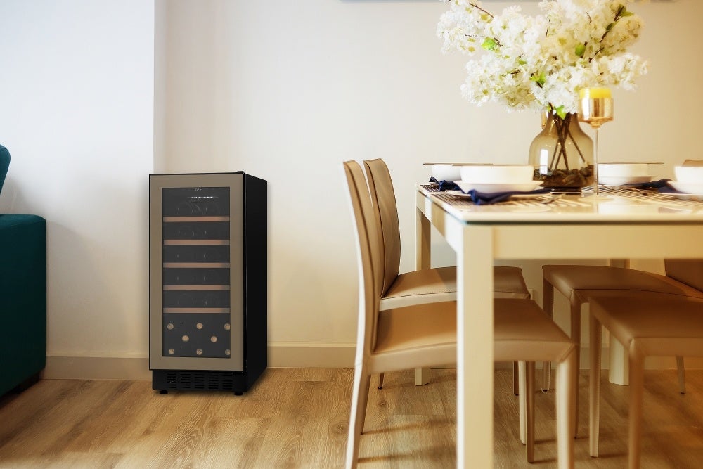 放熱を本体前面から行うことで、必要な放熱スペースを左右5mm、背面5mm、上部5mm(※)に抑えました。通常のワインセラーのように据え置きとしての使用はもちろん、カウンター下へビルトインとして設置することも可能です。※フォルスタージャパンの通常の製品に必要な放熱スペースは左右20mm、背面50mm、上部100mmです。
