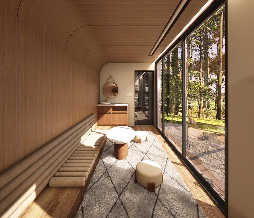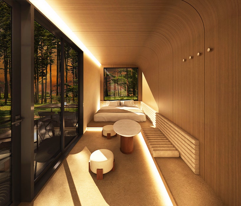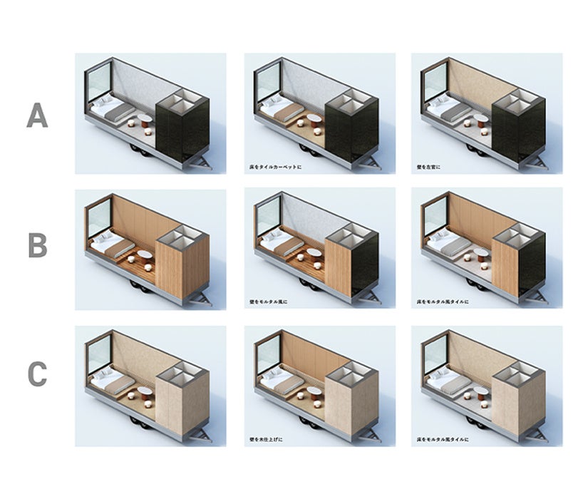 土地や場所を意味する”LOCI”と、宿泊を体験する空間である”HOTEL”を組み合わせ、「LOTEL」と名付けられました。その名の通り、設置する場所の魅力を最大化する宿泊体験のセットアップを意識し検討を重ねたデザイン・レイアウトになっており、外壁・内壁は素材を選べるセミカスタマイズであることが特徴です。素材はミラータイプ、木タイプ、左官タイプの3つのから選ぶことができるので、設置する場所の特性や演出したい宿泊体験に合わせて、空間を構成することができます。
