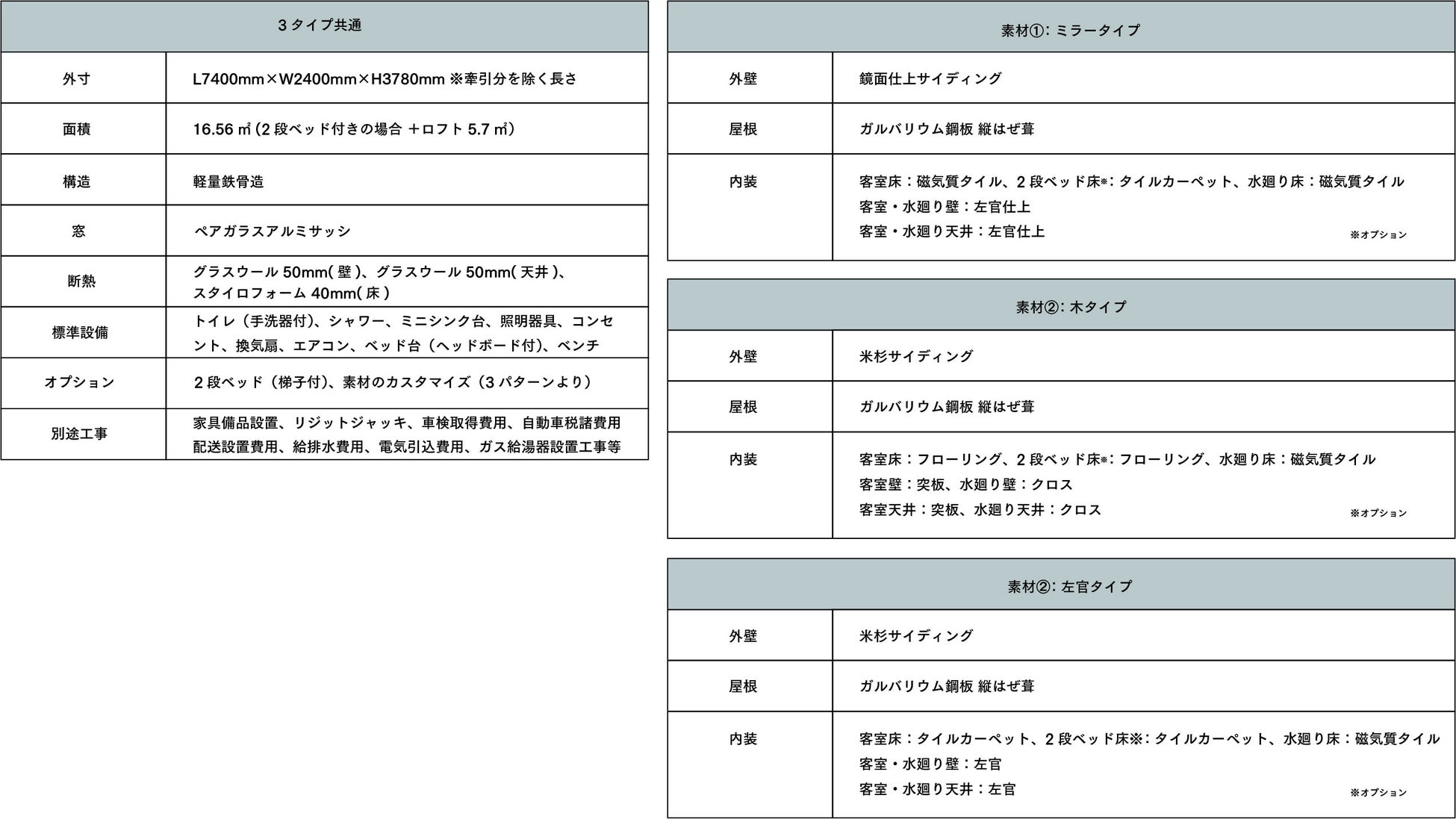 外装・内装のセミカスタマイズとして、ミラータイプ、木タイプ、左官タイプの大きく3種類の仕上げを用意しました。厳選された素材の中から、マテリアルを組み合わせてカスタマイズする事ができます。