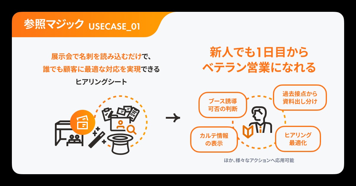 参照マジックを活用することで、名刺を読み込むだけで、その場で商談・契約の有無や企業情報などを参照しスクリーニングし、展示会の現場における最適なアクションをレコメンドすることが可能です。これにより、現場ではじめてお会いするお客様に合ったコミュニケーションを誰でも実現できるようになります。