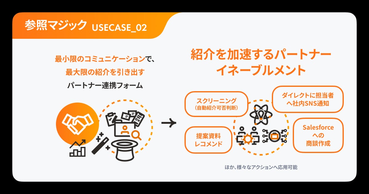 参照マジックを活用することで、パートナー企業が営業候補になる企業名をフォームに入力するだけで、対象企業の業種や規模、契約状況、進行中の商談情報などを参照しその場で提案可否の判定や類似事例コンテンツを提示することができます。
