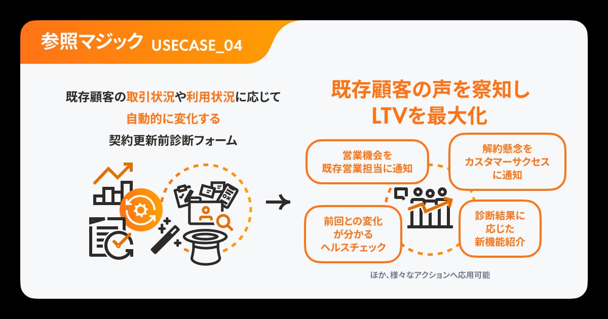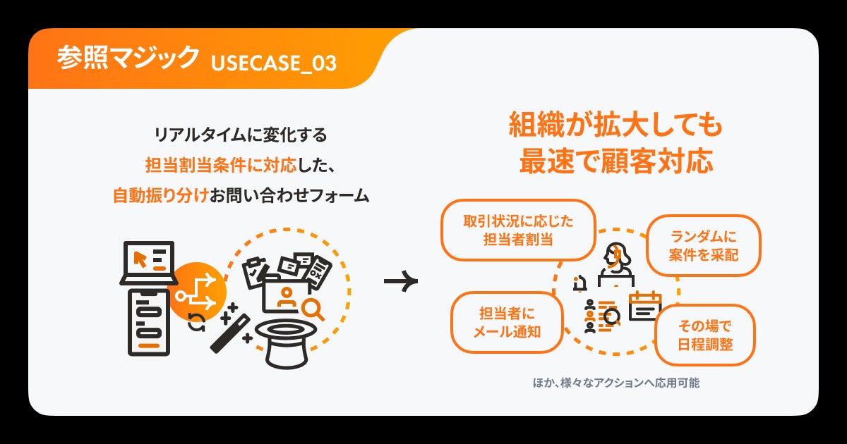 今回発表する「参照マジック」は、従来の「データ収集」のみにフォームを活用するのではなく、その場でデータの「活用」ができる環境を構築することで、オンラインオフライン問わず顧客に合ったタイミングで顧客に合ったコミュニケーションを実現することができます。
