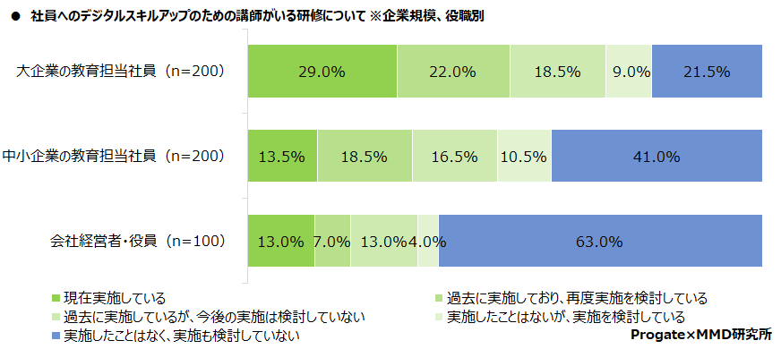 講師がいる研修で「現在実施している」回答は、大企業の教育担当社員(n=200)が29.0%、中小企業の教育担当社員(n=200)が13.5%、会社経営者・役員(n=100)が13.0%となり、大企業と中小企業の差は15.5ポイントとなった。