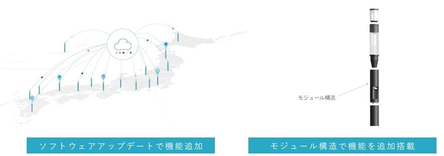 ソフトウェアアップデートによる機能追加で映像解析や情報連携の強化、モジュール構造で機能を追加し、防災 無線などのスピーカー搭載やローカル5Gなどの通信インフラ、災害時用の蓄電池搭載などが可能です。