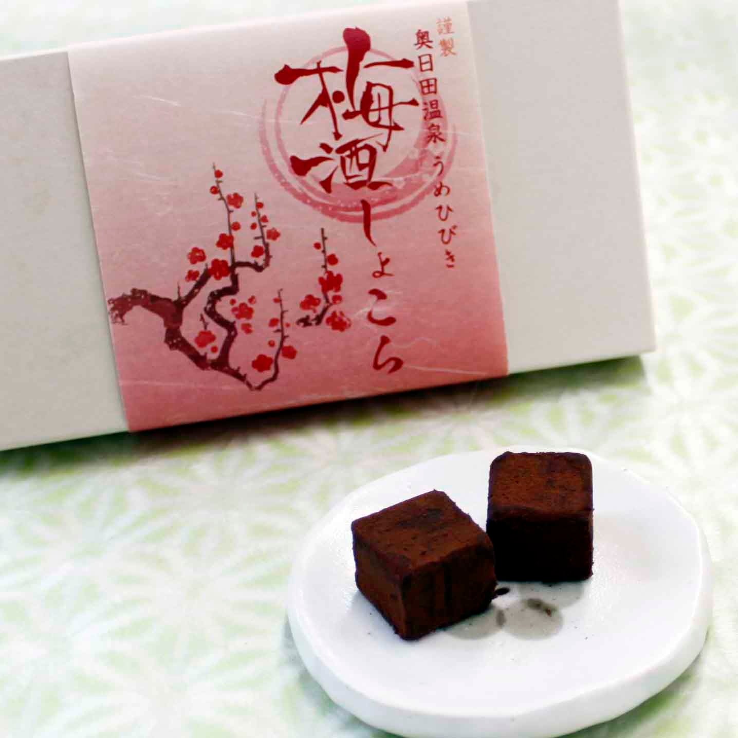 おおやま夢工房が製造する高品質の梅酒「熟成梅酒ゆめひびき」を贅沢に練りこんだ生チョコです。奥日田温泉うめひびきでウェルカムスイーツとしても使用されています。しっとりした口どけと、芳醇な梅酒の風味が特徴の大人のショコラは、梅の花をあしらった優美なデザインのパッケージで贈り物にもおすすめです。