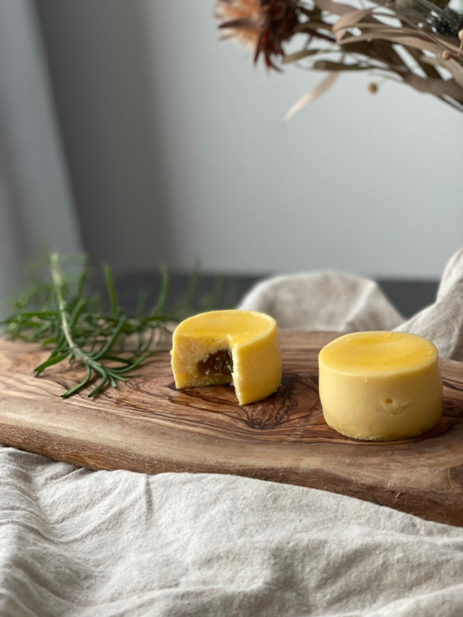 手摘み・朝どれの梅を100%使用し、梅酒づくりのため1年間じっくりと漬け込んだ『梅酒梅』と、おおやま夢工房の自社梅園で栽培したフルーティーで香り高い『樹上完熟南高梅』のピューレを贅沢に使用した逸品です。梅ピューレの香りと、梅酒梅の甘酸っぱさとチーズケーキの相性が抜群な、新感覚スイーツです。