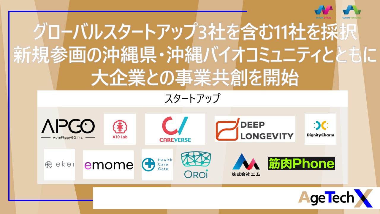 スクラムスタジオ株式会社(本社:東京都港区、代表取締役社長:髙橋正巳)と株式会社博報堂が主催する『AgeTechX』ではこの度、1期目のグローバル事業共創プログラムに参加するスタートアップとして、海外スタートアップ3社を含む、合計11社のスタートアップを採択いたしました。