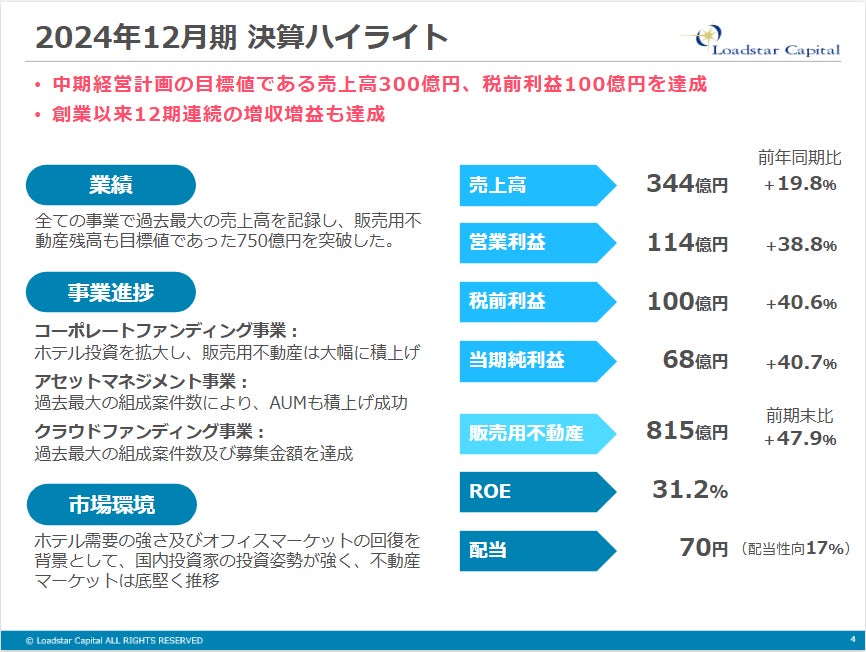 「不動産とテクノロジーの融合が未来のマーケットを切り開く」をミッションとして不動産投資事業とFintech事業をグループで展開するロードスターキャピタル株式会社(本社:東京都中央区、代表取締役社長:岩野達志、東証プライム市場・3482)は2025年2月14日、2024年12月期の通期決算を発表しました。