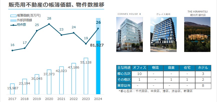 ・将来の経営基盤となる販売用不動産は2024年末時点で26件815億円となりました。含み益も約340億円(税控除前)積上げております。