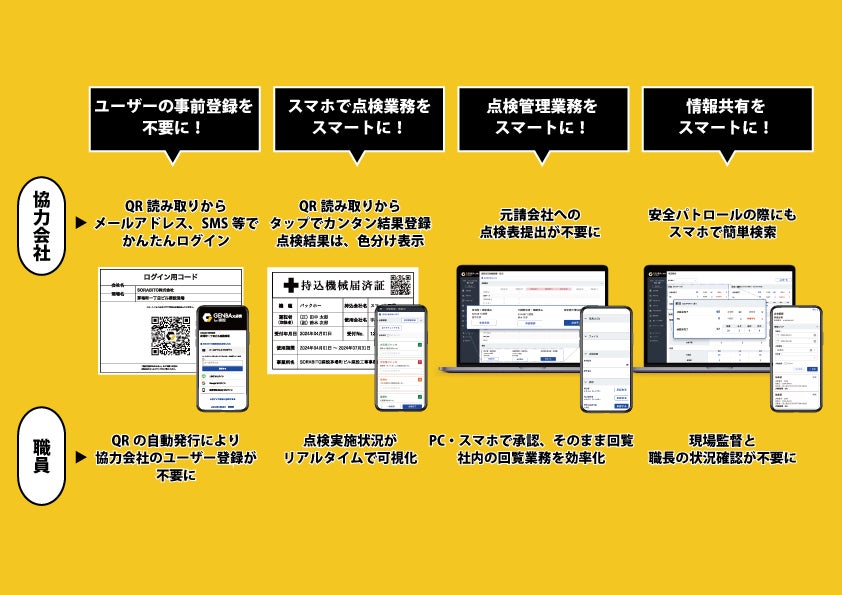 SORABITO株式会社(代表取締役:博多一晃、本社:東京都中央区、以下「SORABITO」)は、建設現場における安全点検の管理業務を効率化する新サービス「GENBAx点検」をこの度正式にリリースすることをお知らせいたします。2023年12月のブランド発表以降、多くの建設会社様に実際の建設現場で本サービスのトライアル版をご利用をいただき、ユーザーからの声を大いに生かしつつ開発を進めて参りました。SORABITOは、本サービスを通じ建設現場の安全性及び生産性の向上に貢献するとともに、建設業において喫緊の課題となっている所謂「2024年問題」の解決にも寄与して参ります。