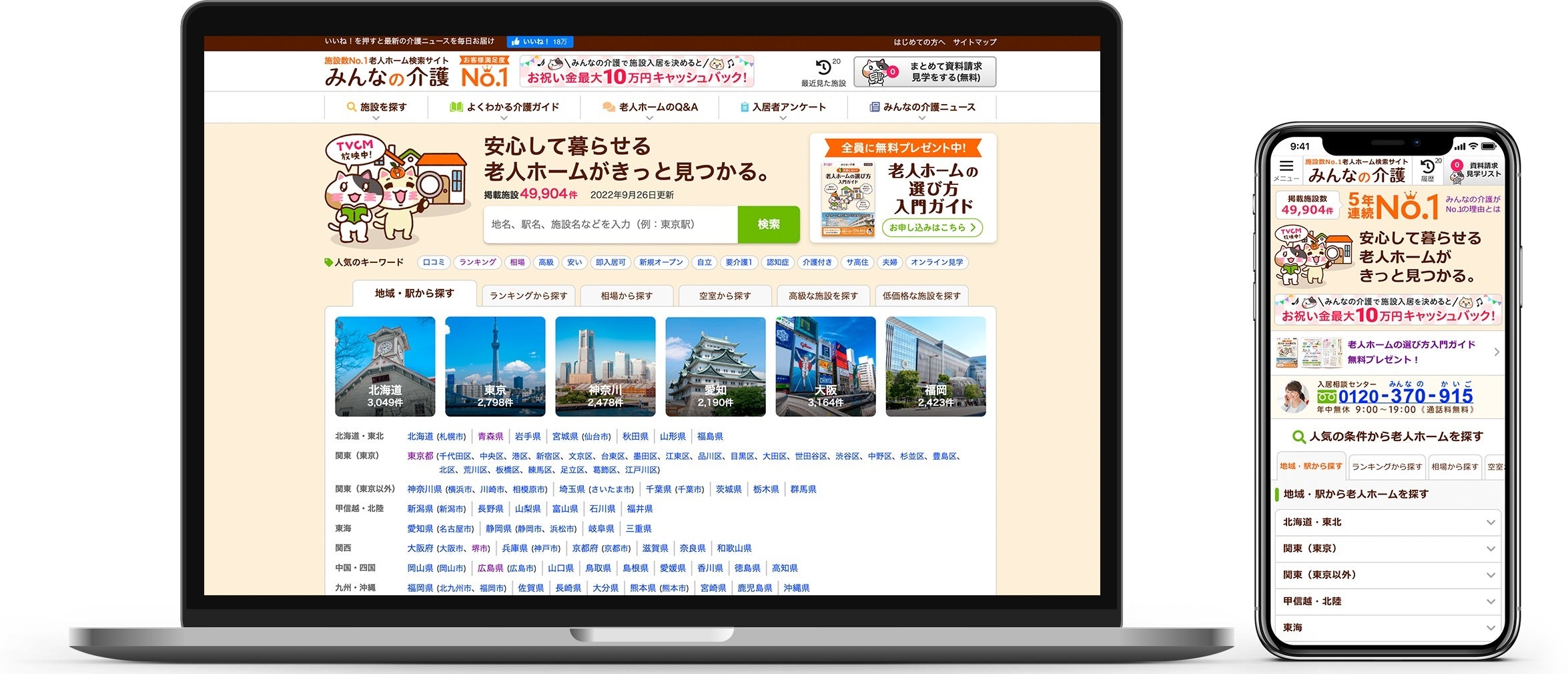 ※主要な老人ホーム検索サイトを対象に掲載施設数の調査を行った結果、みんなの介護がNo.1を獲得しました。