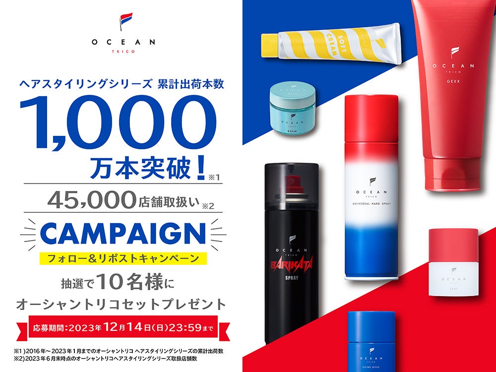 原宿発の美容室OCEAN TOKYOプロデュース「オーシャントリコ」累計出荷1,000万本※1(展開店舗数45,000店舗※2)突破を記念しスタイリングシリーズセットが当たるキャンペーン開催!