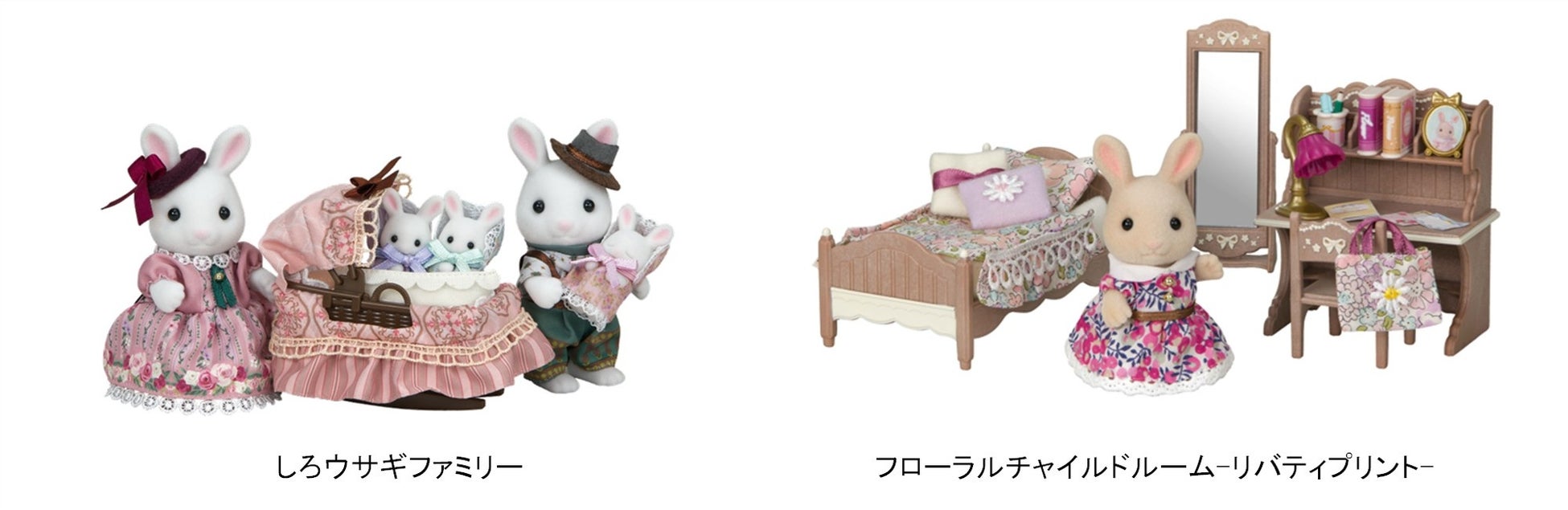 エレガントなお洋服をきた「しろウサギファミリー」やリバティプリントでコーディネイトされたお人形と家具のセットの「フローラルチャイルドルーム-リバティプリント-」、赤ちゃんのダイカットステッカーなど可愛い商品が目白押し!