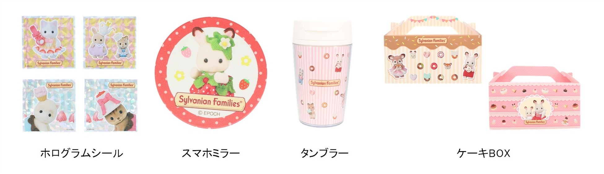 ドーナツを持った赤ちゃん人形の写真が入ったタンブラーやいちごモチーフのスマホミラー、ホログラムシールな