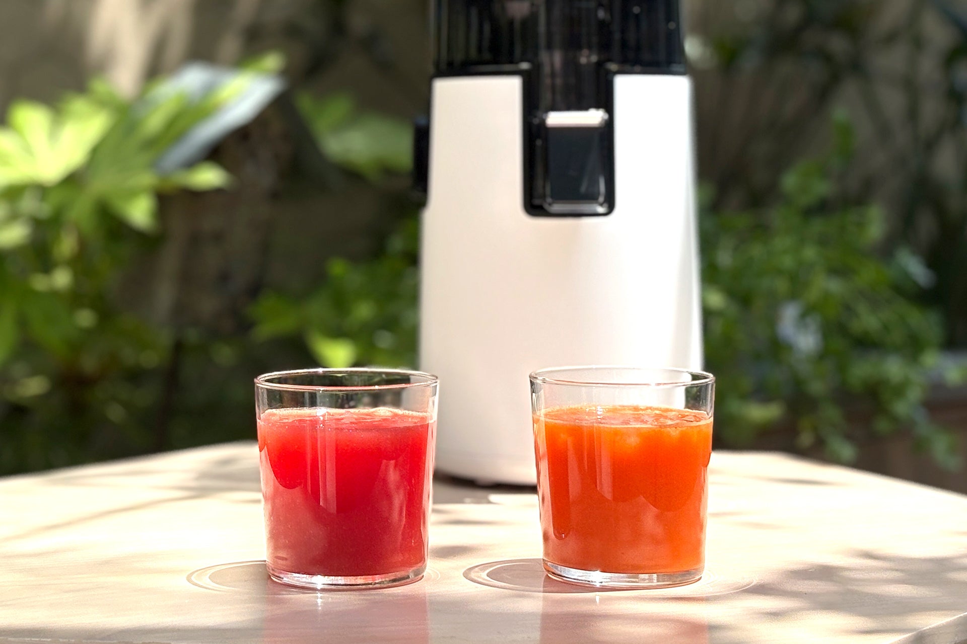 ヒューロムのコールドプレスジューサーは、独自技術の低速搾汁方式(スロースクイージング テクノロジー)で搾るため、熱に弱い酵素やビタミンを壊しにくく、素材本来の風味や栄養が詰まった生ジュースを作ることができます。