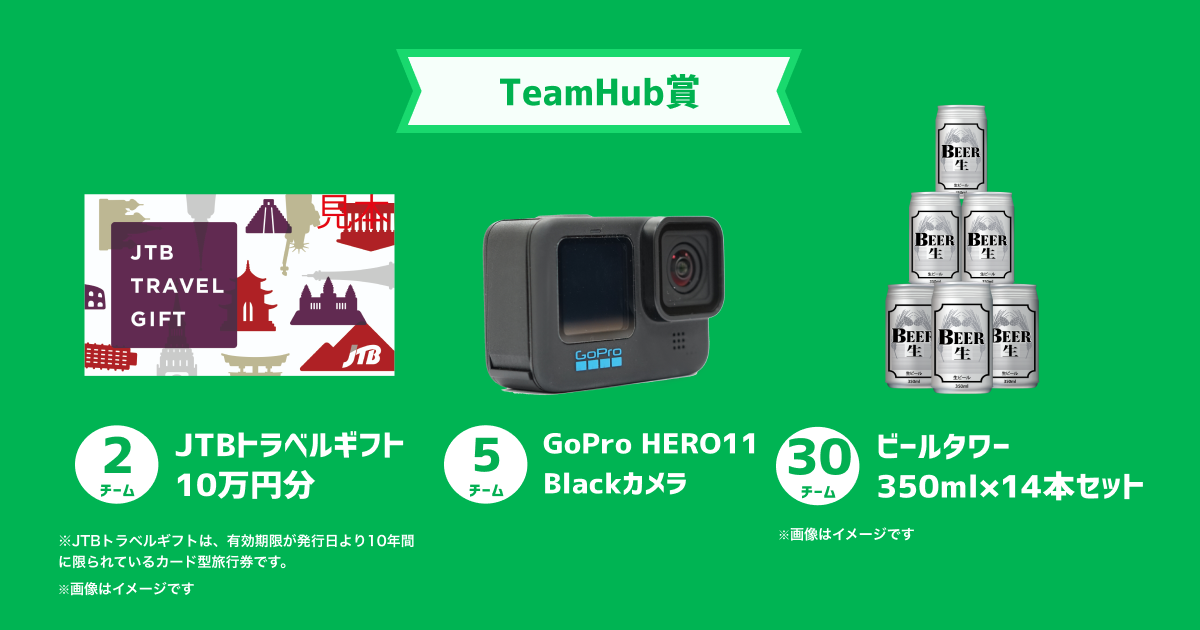 ・TeamHubのアプリでご参加の方は、ご登録いただいているメールアドレスへ当選の連絡と賞品に関するご案内をお送りいたします。