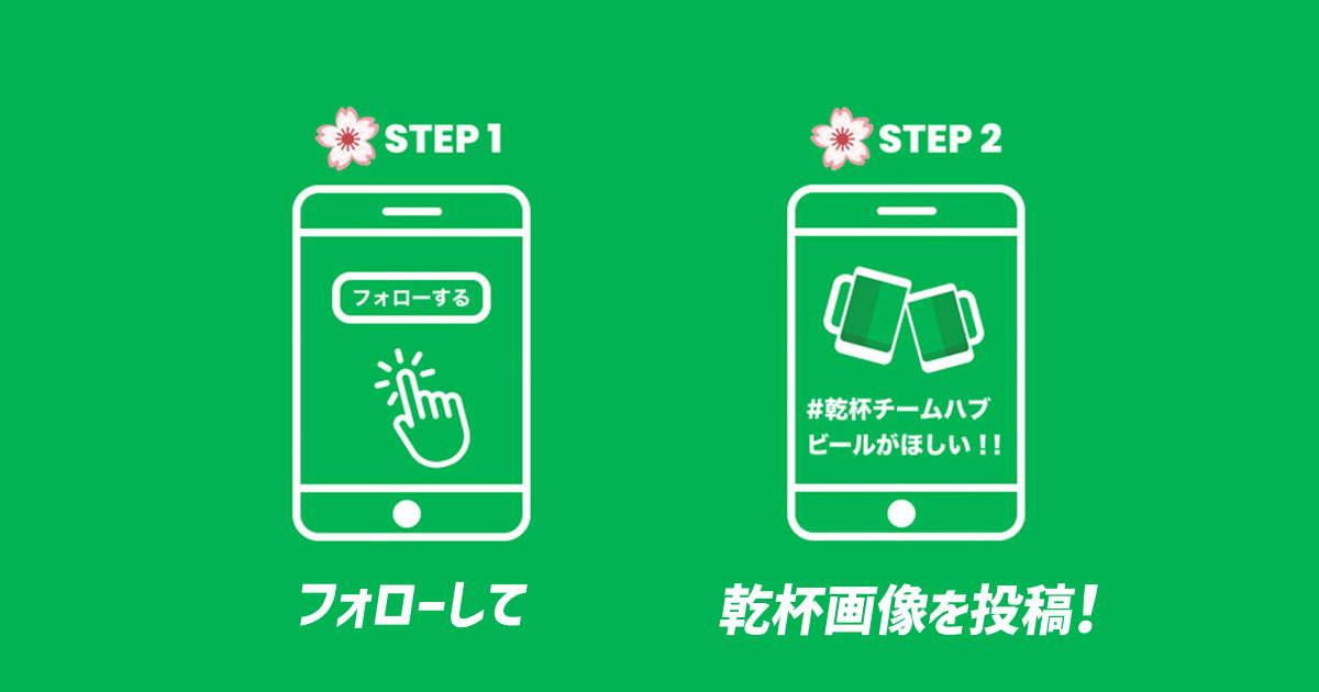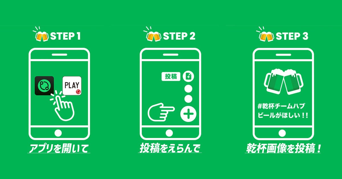 ②チームメイトと一緒に乾杯をしている画像、もしくは動画をアップロードし、欲しいプレゼントを明記し、ハッシュタグ「#乾杯チームハブ」をつけて投稿で応募完了となります。