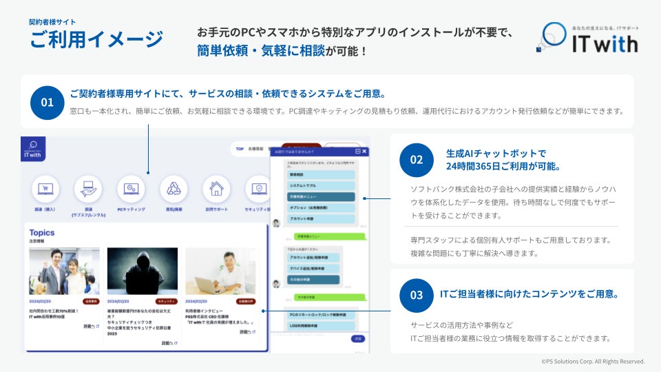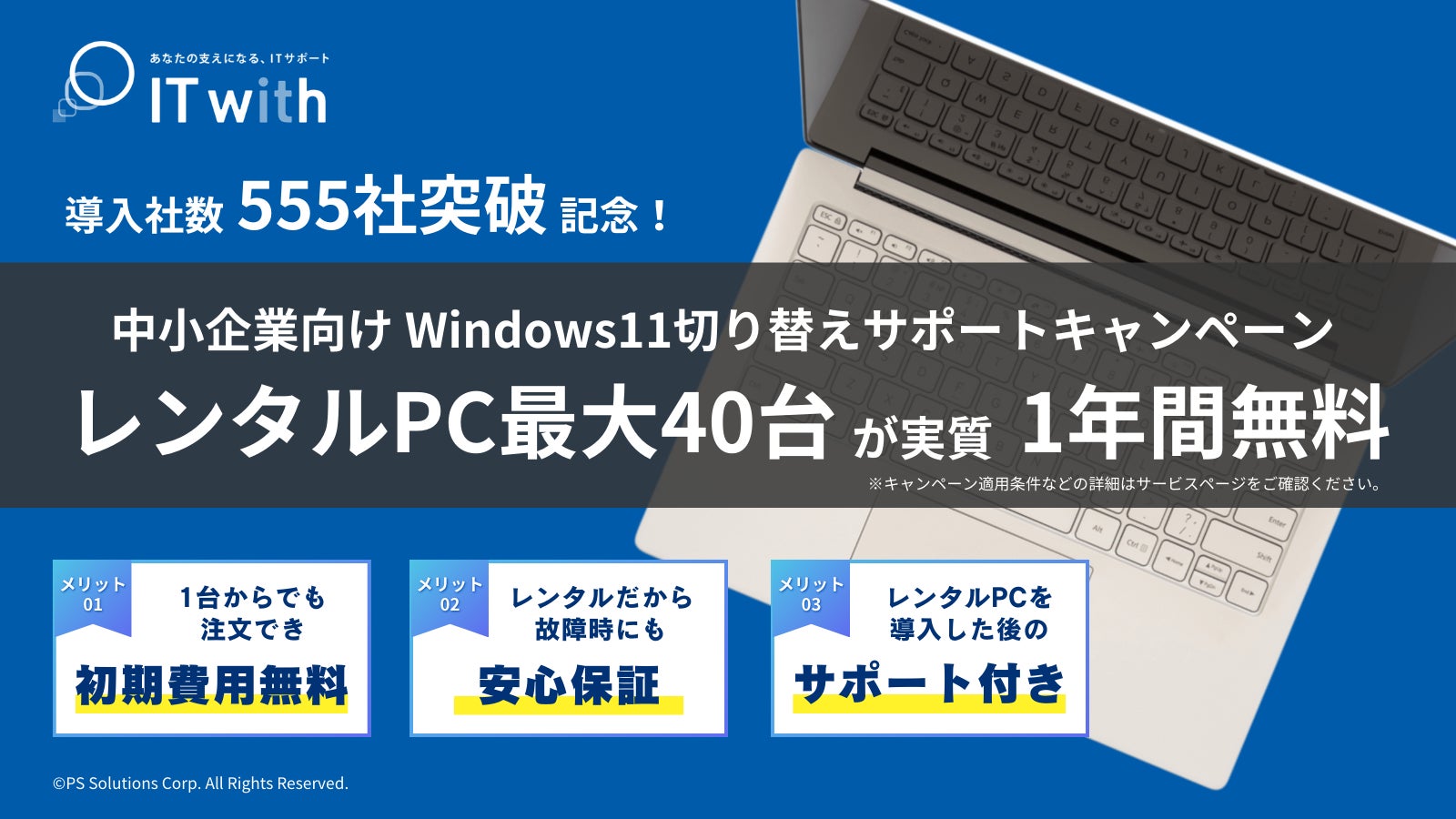 PSソリューションズ株式会社(本社:東京都港区、代表取締役社長:村松佑樹)は、中小企業向けITサポートサービス「IT with」を2024年2月15日から提供開始し、約3カ月で、導入社数が555社を突破したことを記念して、「Windows11切り替えサポートキャンペーン」を実施いたします。
