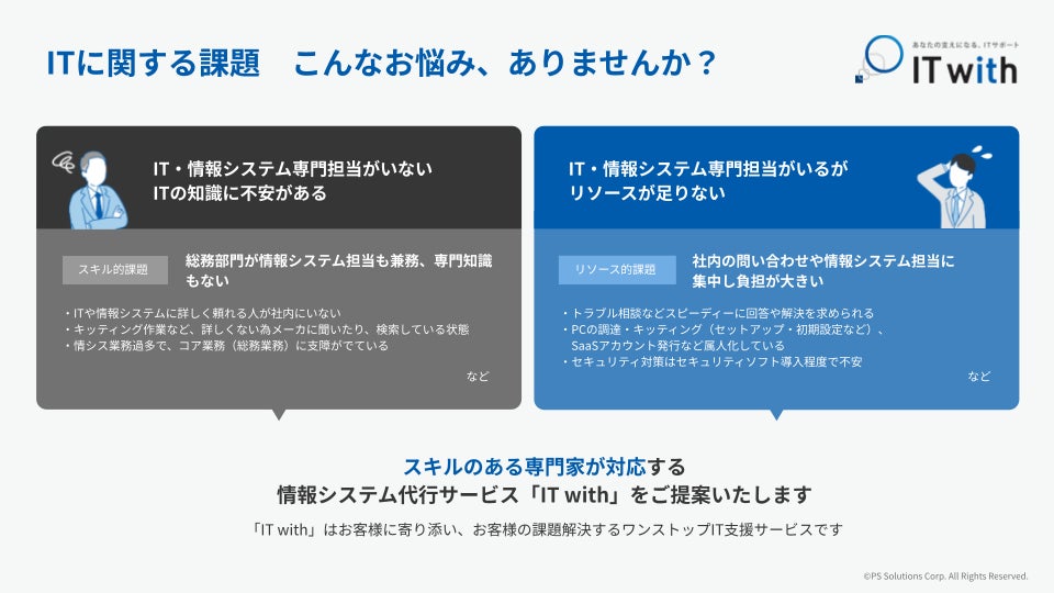 「IT with」は、PC調達やキッティング、ヘルプデスク業務、セキュリティ対策など、中小企業向けに社内のIT化や情報システムなどの業務をサポートし、多岐に渡るIT支援を通じて、お客様とともに「安心」と「成長」を創造する伴走型サービスです。IT領域の頼れるパートナーとして、社内のIT化や情報システム業務における課題を二人三脚でサポート。お客様とともに(with)歩みながら、コスト削減や利益拡大に貢献し、企業の成長を後押しいたします。