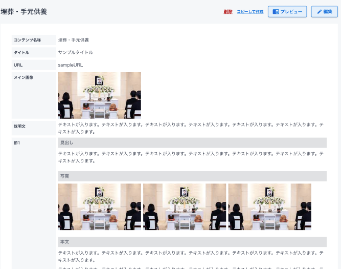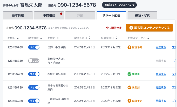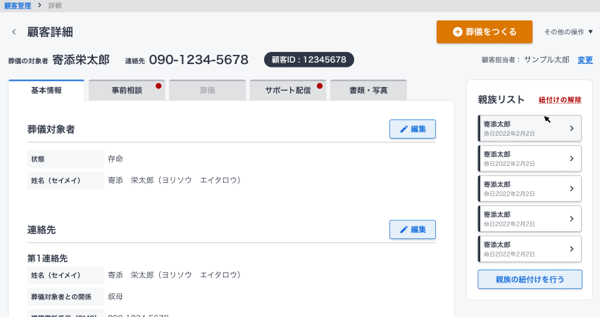 喪主さまの基本情報はもちろんのこと、事前の相談内容、お葬式の内容、サポート配信内容、顧客ごとの書類やお葬式時の写真などを登録可能です。よりそうクラウド訃報案内とあわせて利用いただくことで、訃報案内を作成したときに登録した情報が、自動でよりそうクラウドの顧客情報として登録され、よりそうクラウドの顧客管理機能から閲覧可能となります。