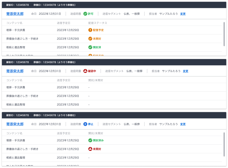 顧客に対するアフターフォローのSMSが、顧客/宗教/葬儀形態などに応じた配信内容やタイミングで自動配信されます。これにより、葬儀社様はお葬式後の顧客に対して抜け漏れなく継続的なコンタクトが可能となり、アフター商材の営業機会を効率的に創出することが可能となります。 また、顧客のSMSの開封状況などを確認することもできるため、アフターフォロー業務の効果測定も可能です。