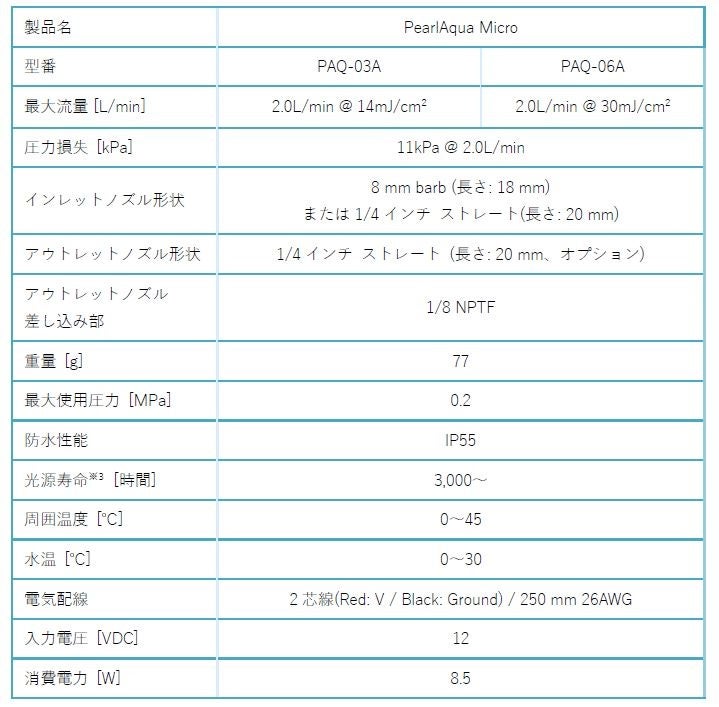 PearlAqua Micro Aモデルには、対応流量の異なる「PAQ-03A」と「PAQ-06A」の二つの型式があります。お客様の使用環境や求められる流量などの要求性能に合わせ、上記の型式からより適切なモデルを提案します。また、必要に応じて、PearlAqua Micro Aモデルに限らず、日機装水除菌製品ラインアップから適切な製品の提案を行います。