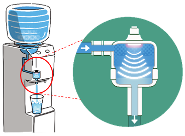 本製品は、2つの使用方法があります。1つめは、機器の吐水口に設置(Point of Dispense)する方法です。ウォーターサーバーなどの機器においては、吐水口に至るまでの配管内で細菌やウイルスが繁殖してしまうという懸念があります。本製品を吐水口に設置し、エンドユーザーが水を飲む直前に流水除菌を行うことで、よりクリーンな水を提供することが可能となります。2つめの使用方法として、本製品のノズル自体を機器の吐水口として使用することも可能です。吐水口に付着しやすい浮遊菌対策として、機器の運転停止時に一定間隔で紫外線を照射し吐水口内部の表面除菌を行うため、吐水口をクリーンな状態に保つことが可能となります※2。