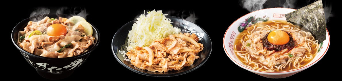 左から、「すた丼」「生姜焼き定食」「すたみな肉そば」※「すたみな肉そば」は新宿西口総本店・高円寺店・イオンタウン稲城長沼店3店舗限定販売です。