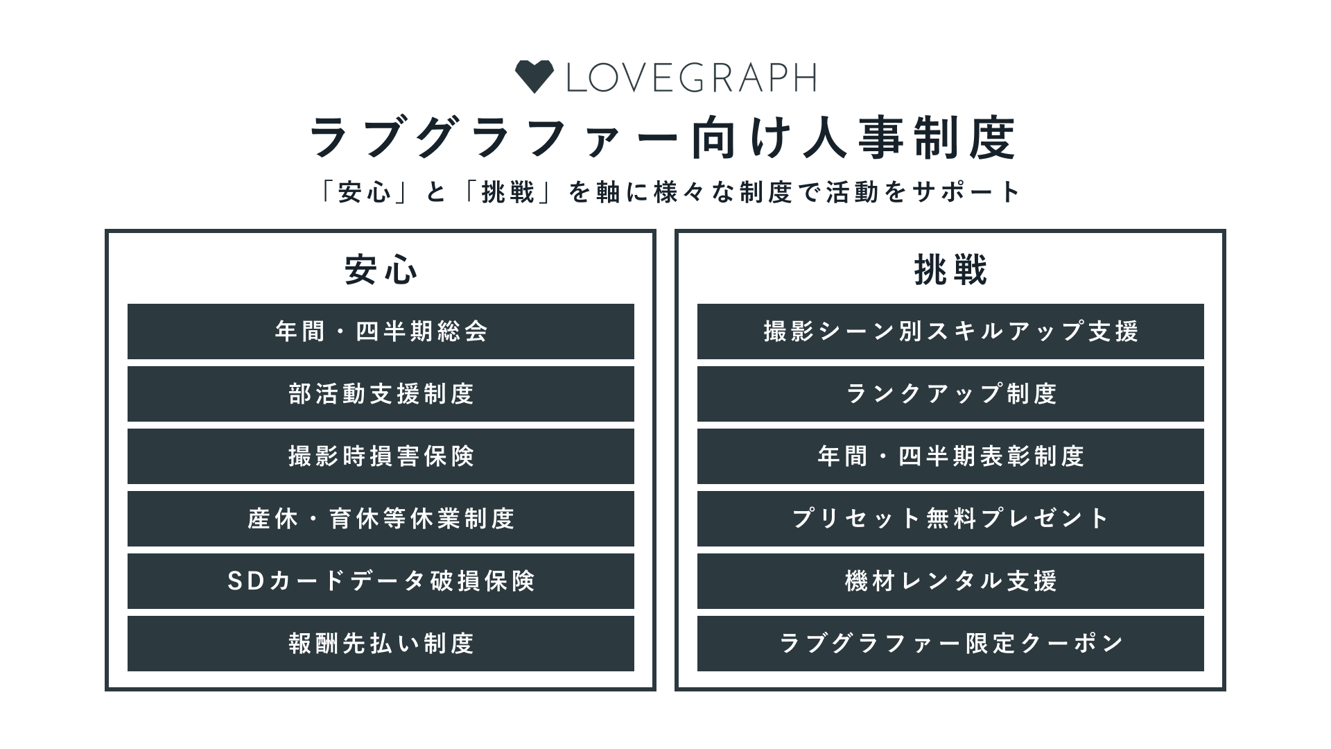 ラブグラフでは、今回の損害保険への加入をはじめとして、カメラマンが生き生きと働けるよう様々な人事制度を整えています。同じ志を持った全国の仲間たちと、ぜひ一緒にラブグラフで働きませんか?