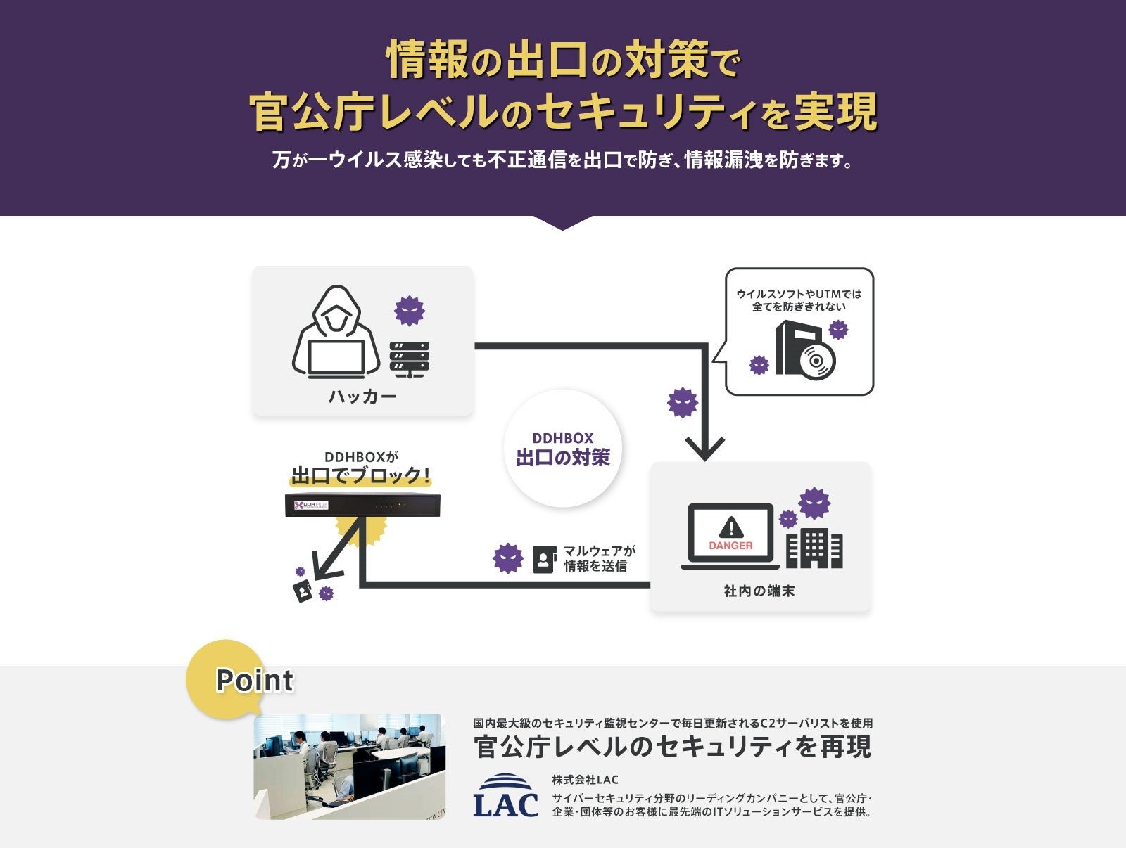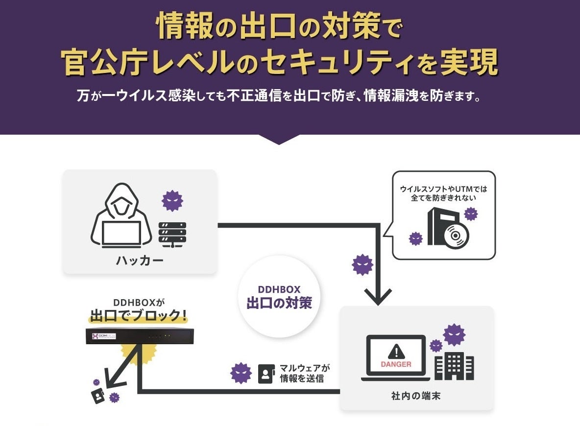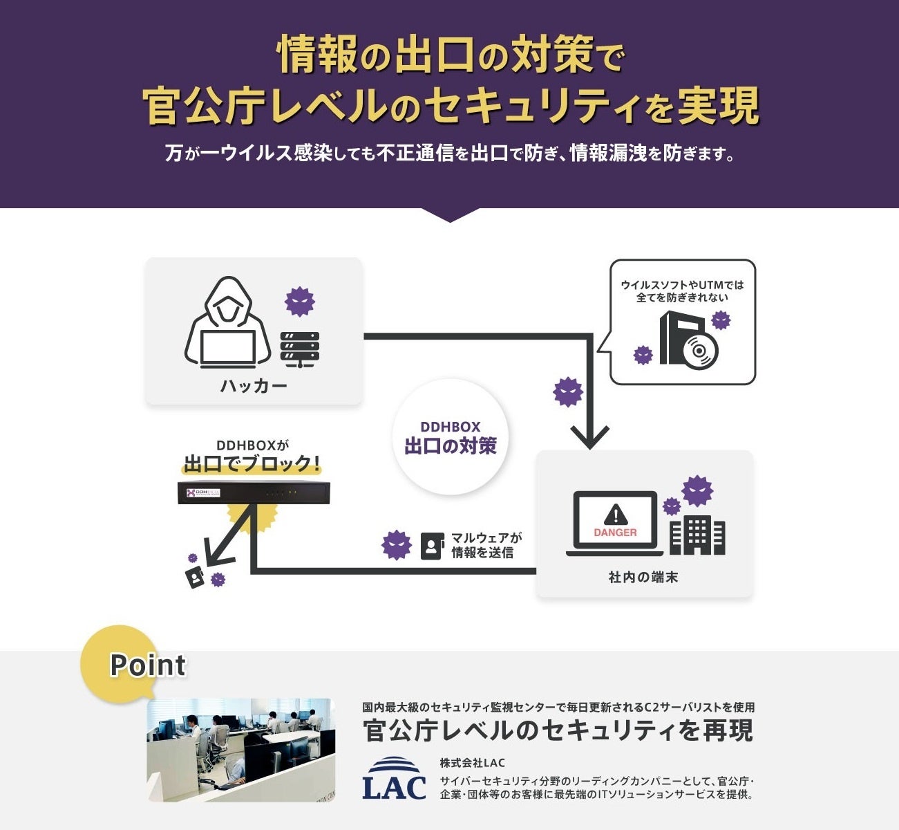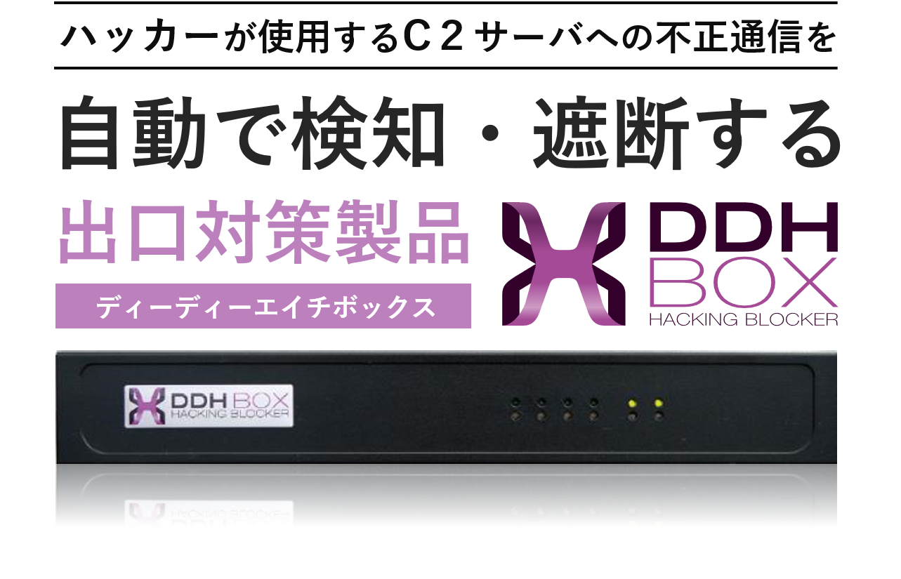 そこで『DDHBOX』では、国内最大のセキュリティ監視センター『JSOC』が検出した「C2サーバリスト」を活用し、官公庁で行われるものと同レベルの通信監視を自動化することに成功しました。