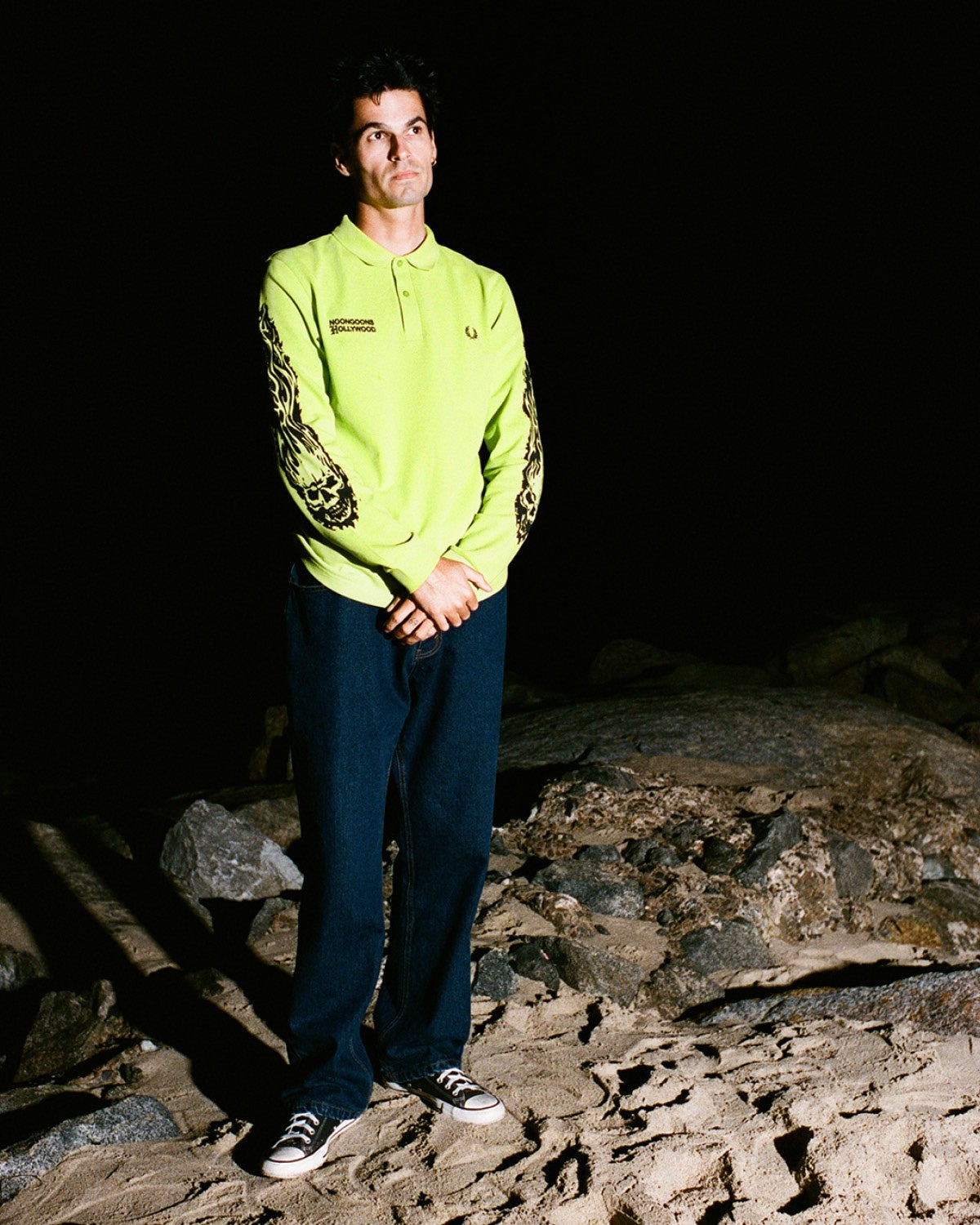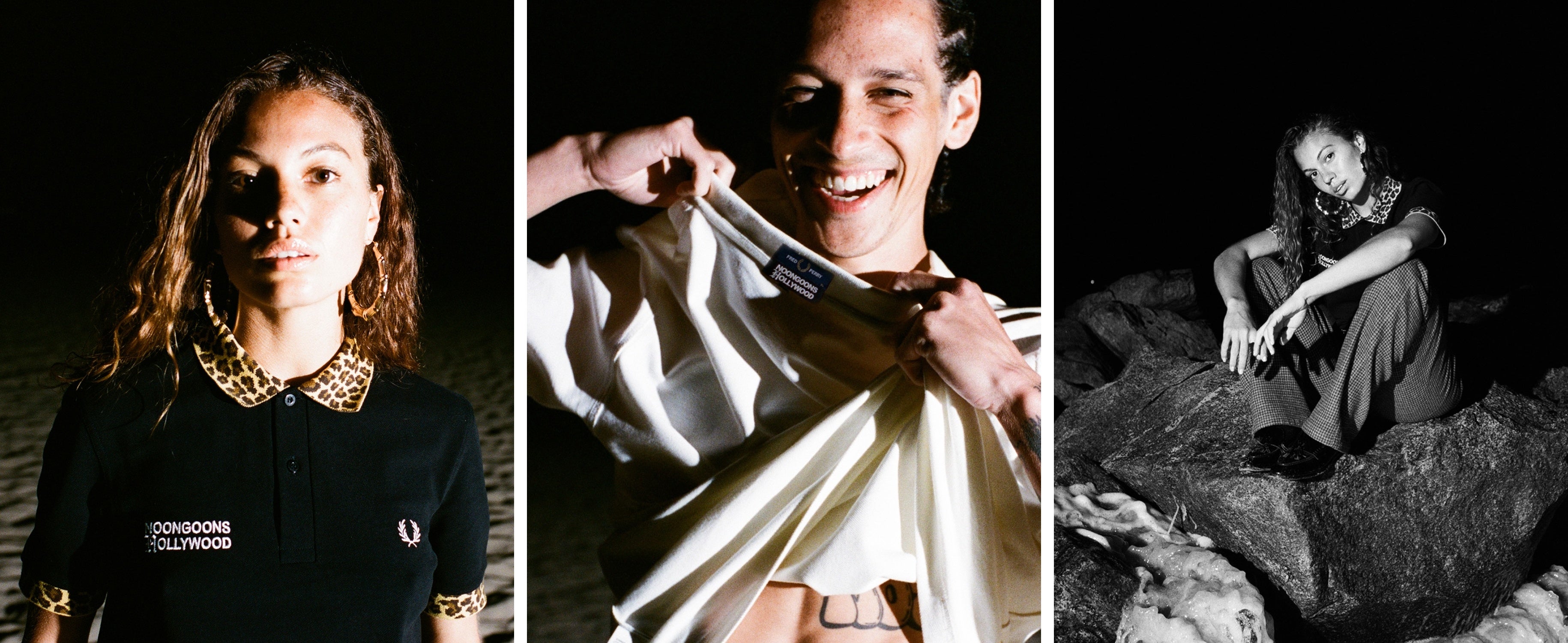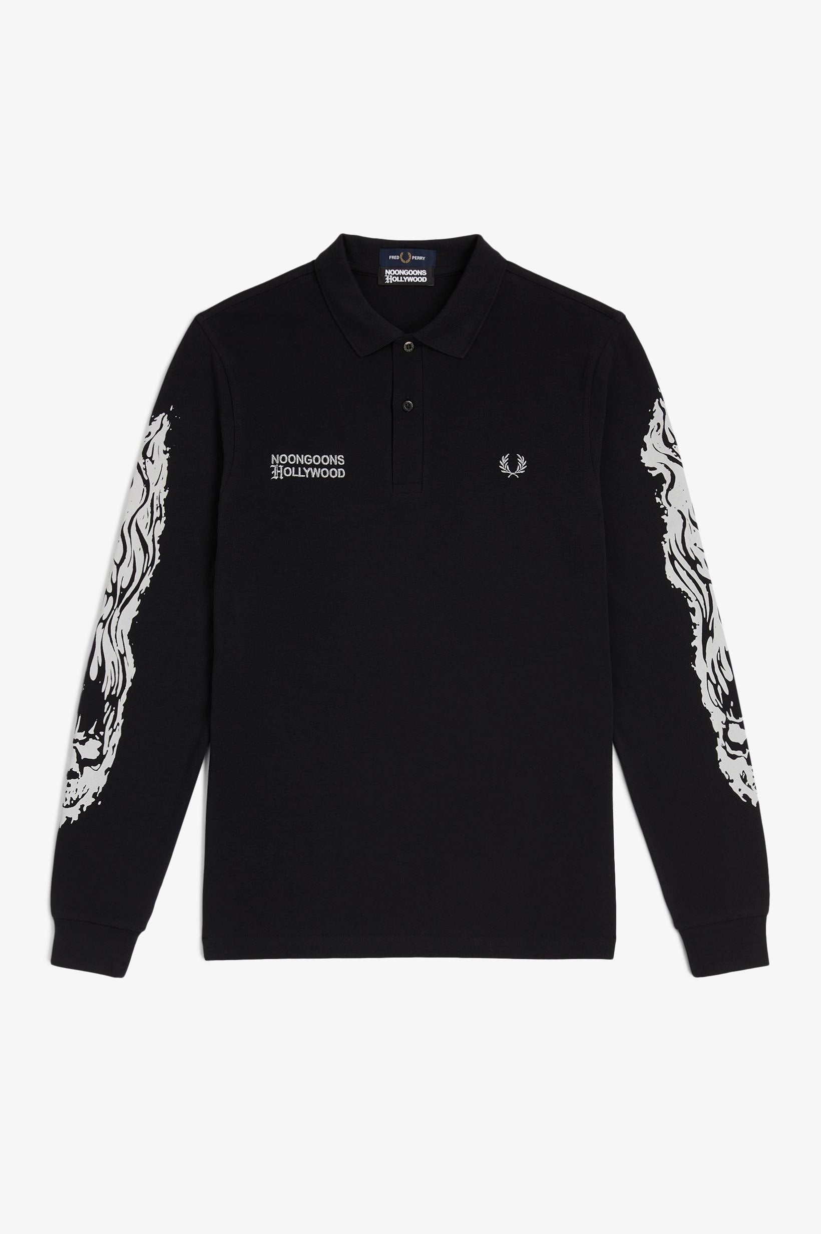 Noon Goonsは、イギリスとアメリカのカウンターカルチャーを融合し、フレッドペリーシャツに4つのユニークなバリエーションを加えました。レオパード柄のトリミング、大胆なレタリング、炎を閉じ込めたスカルデザインなど、どのアイテムもFRED PERRYのシグネチャーであるピケ素材と時代を超越したポロシャツのシルエットを活かしながらも、今までに見たことのないシャツをデザインしました。