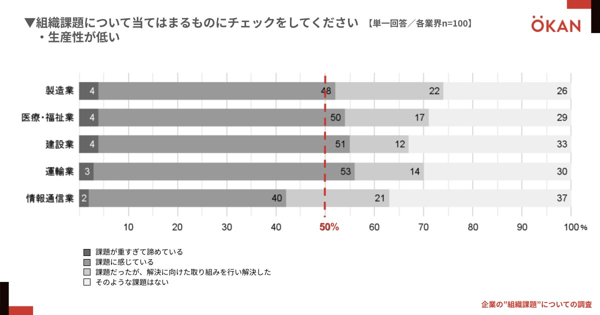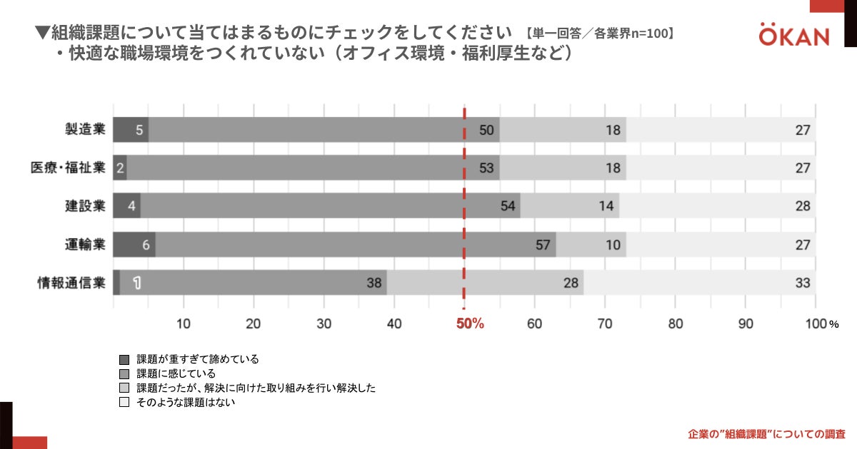 「働く⼈のライフスタイルを豊かにする」をミッションに、望まない離職を生まない組織づくりを支援する株式会社OKAN(代表取締役:沢⽊恵太、本社:東京都豊島区)は、製造、医療・福祉、建設、運輸、情報通信業において人事・総務関連業務者(総務担当もしくは10名以上の企業の経営者)各100名(計500名)を対象に、企業の組織課題についての調査を実施いたしました。