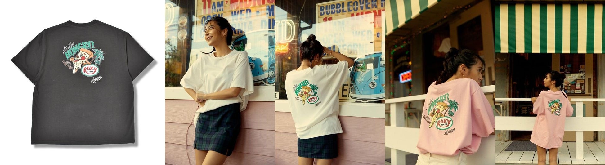 「ムラスポ×ROXY×FUSTY WORKS」Tシャツは、カリフォルニアを中心に、ビーチカルチャーとアクティブなライフスタイルを愛する女の子たちからの「女の子のためのビーチウェアが欲しい」という声から1990年に誕生したブランド「ROXY」と、架空のレストラン「ROXY DINER」をコンセプトに、多くのアパレルメーカーなどにグラフィックを提供してきたFUSTY WORKSのKEN SUGIHARA氏とのトリプルコラボとなります。