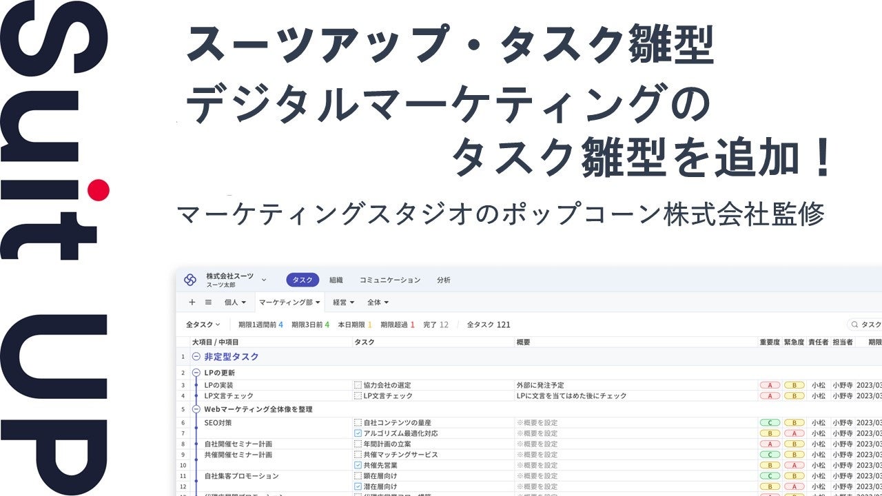 株式会社スーツ(所在地:東京都千代田区、代表取締役社長CEO:小松 裕介)は、チームでかんたん、毎日続けられるプロジェクト・タスク管理ツールの経営支援クラウド「Suit UP」(スーツアップ)において、マーケティングスタジオのポップコーン株式会社(所在地:東京都渋谷区、代表取締役社長:大澤 陽平)が監修するデジタルマーケティングのタスク雛型を追加したことをお知らせします。