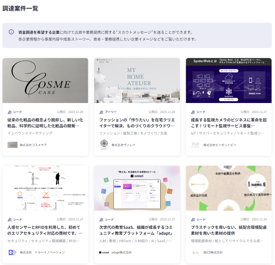 ▼資金調達クラウド『調達案件一覧』(出資企業からスカウトを受けられる企業)